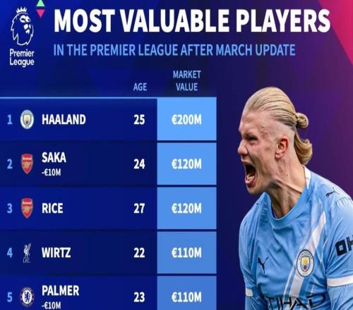 北京時間3月9日,在更新了英超球員的身價之后,德轉(zhuǎn)還統(tǒng)計出了此次更新后英超身價最高的10名球員,哈蘭德繼續(xù)以2...