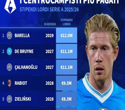 北京時間2月20日,德轉(zhuǎn)統(tǒng)計出了本賽季意甲稅前年薪最高的10名中場球員,巴雷拉以1200萬歐元排名第一,德布勞內(nèi)和...