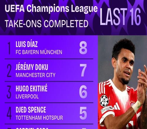 路易斯迪亞斯完成8次過人,為本賽季歐冠單場(chǎng)最高數(shù)據(jù)