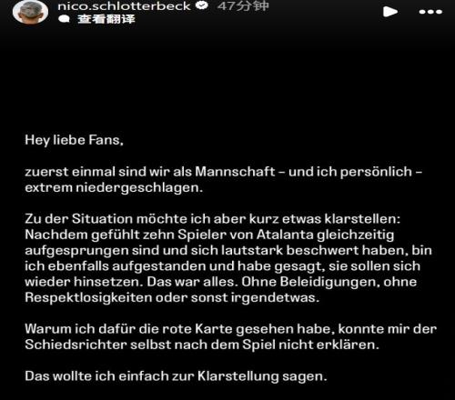施洛特貝克對(duì)紅牌提出質(zhì)疑表示我只是想讓亞特蘭大安靜主裁賽后同樣無言以對(duì)_德甲直播