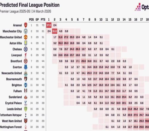 超級計(jì)算機(jī)預(yù)測英超奪冠概率:阿森納97.6%,曼城僅2.43%