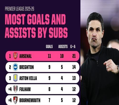 本賽季英超替補(bǔ)參與進(jìn)球榜:阿森納21球居首,曼城2球墊底