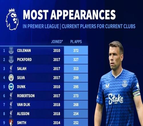 北京時(shí)間4月29日,德轉(zhuǎn)列出了英超球員在現(xiàn)俱樂部中聯(lián)賽出場數(shù)排名,埃弗頓老將科爾曼以372場高居第一,薩拉赫、伯...